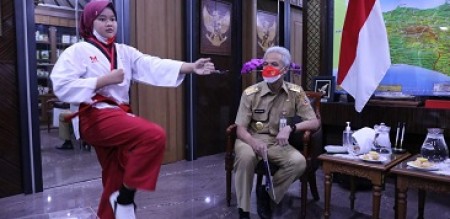 INDONESIAPERSADA.ID I SEMARANG - Anandea Sekar Rafina (10) unjuk kebolehan sebagai atlet taekwondo belia peraih empat medali emas dalam waktu 20 hari saat berkunjung ke kantor Gubernur Jawa Tengah Ganjar Pranowo, Senin