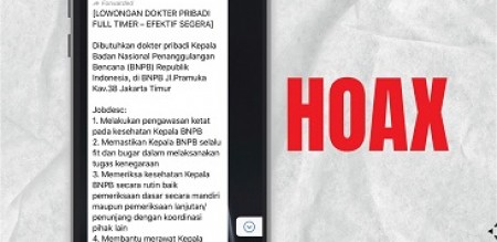 INDONESIAPERSADA.ID I JAKARTA – BNPB mengkonfirmasi pengumuman ‘Lowongan Dokter Pribadi Full Timer – Efektif Segera’ tidak benar. BNPB tidak pernah membuat atau pun menyebarluaskan pengumuman